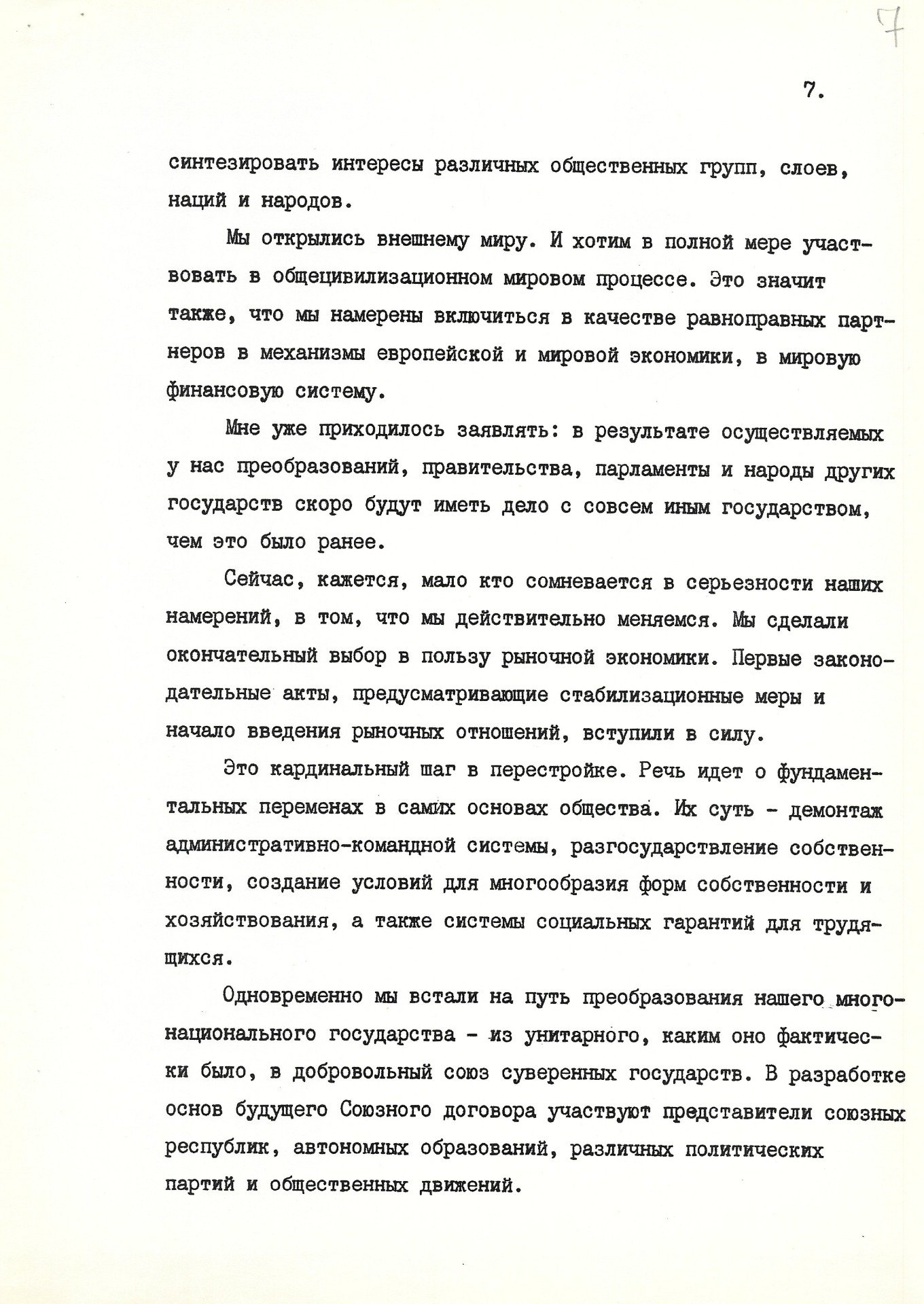 Оценивания происходящие (и уже произошедшие) перемены, в проекте выступления (немного отличавшегося от итогового текста) Горбачев отмечал: