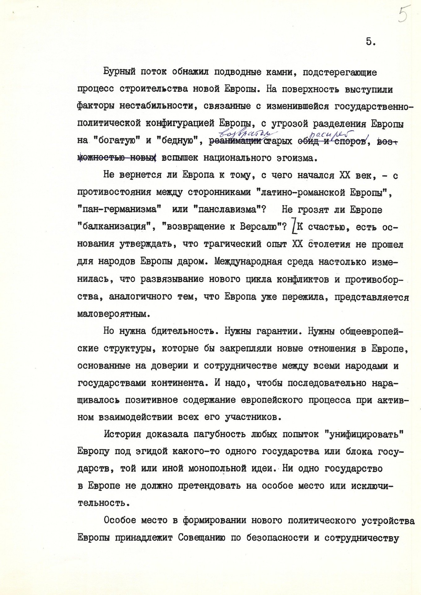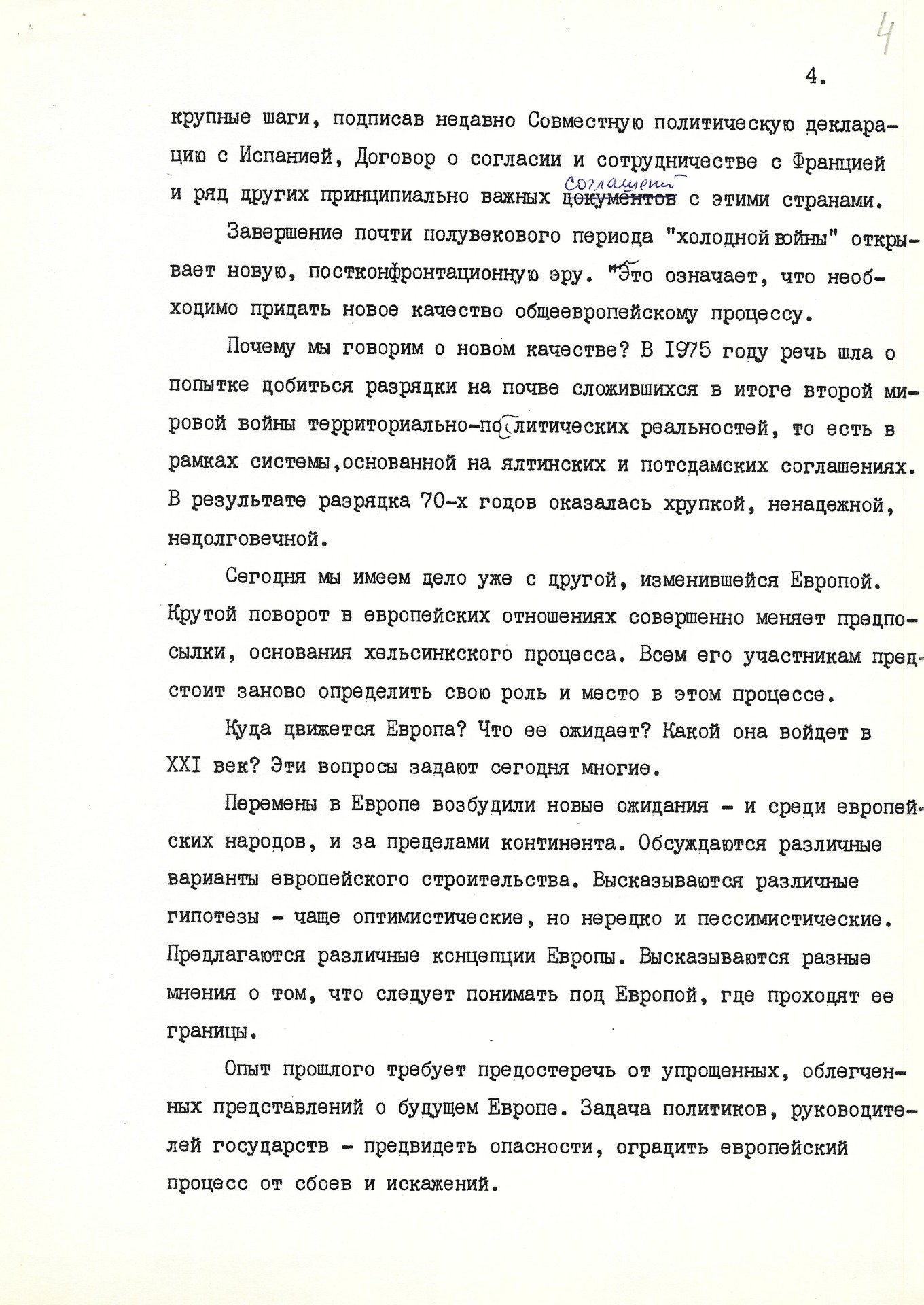 Сегодня мы имеем дело уже с другой, изменившейся Европой. Крутой поворот в европейских отношениях совершенно меняет предпосылки, основания хельсинкского процесса. Всем его участникам предстоит заново определить свою роль и место в этом процессе».