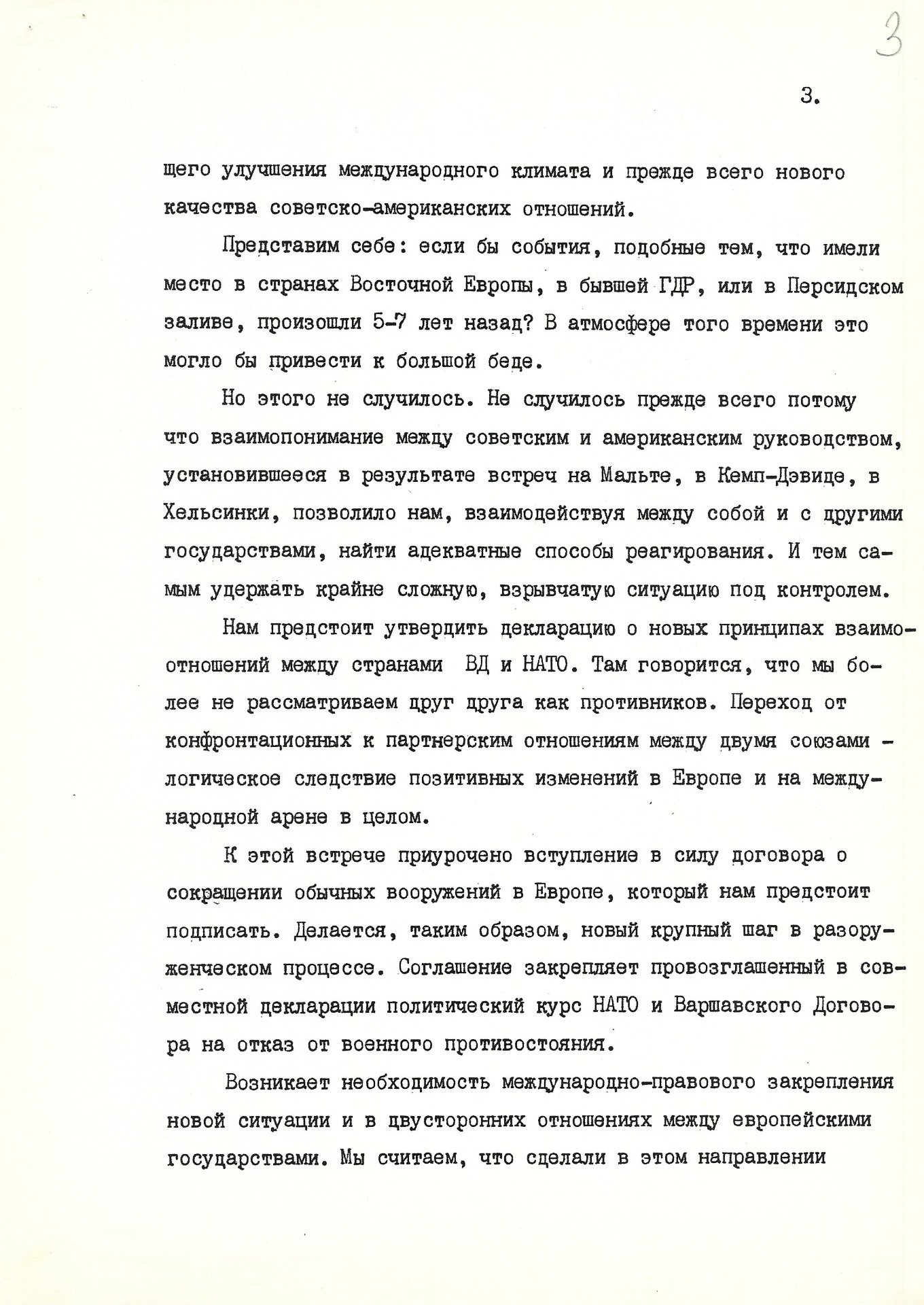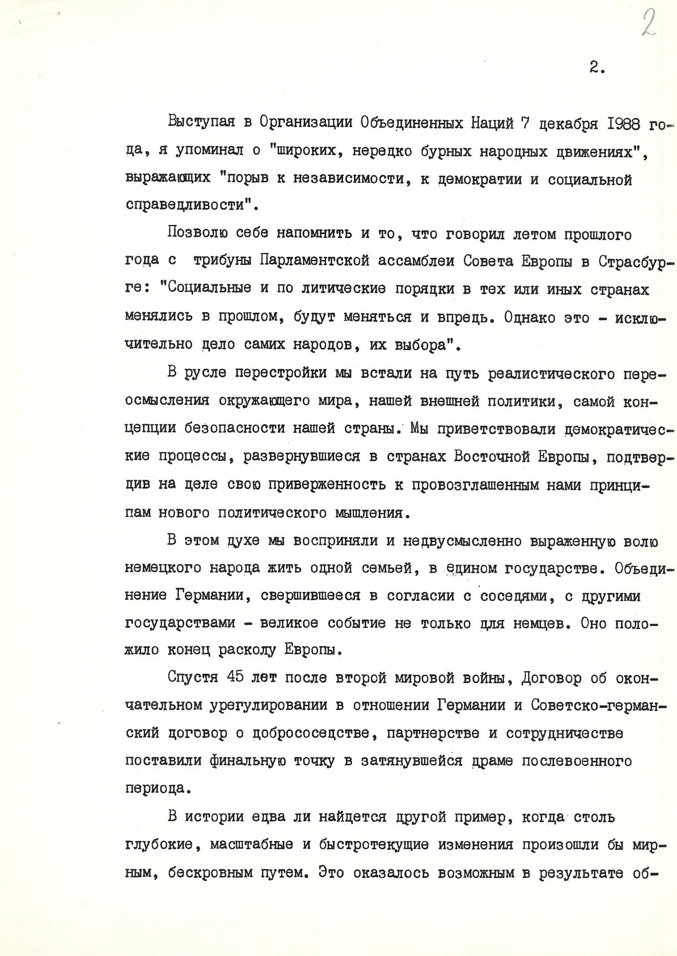 «В истории едва ли найдется другой пример, когда столь глубокие, масштабные и быстротекущие изменения произошли бы мирным, бескровным путем. Это произошло в результате общего улучшения международного климата, и прежде всего — нового качества советско-американских отношений».